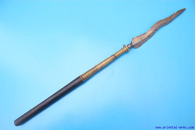 Late 19 C. Indonesian spear, with good wavy blade 10 inches long. Brass sleeve 7 inches long. Wood haft, unfortunately cut short. Total length 26 inches. Very good condition.