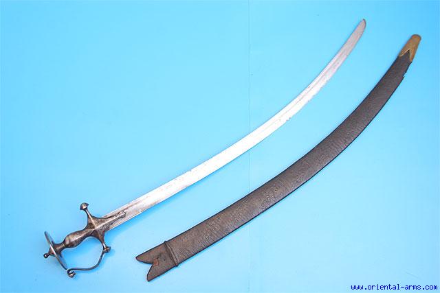 From India, probably late 18 – early 19 C, comes this heavy fighting Tulwar sword. The curved and fullered blade is 30 inches long, engraved and marked 40 on the spine and well balanced. The steel handle is of classical form and of rather large dimensions with very wide pommel disk. Original scabbard covered with very finely tooled leather. Total length 36 inches. Very good condition. Grinding signs on the blade and lightly reshaped tip. Small losses to the leather on the scabbard. |