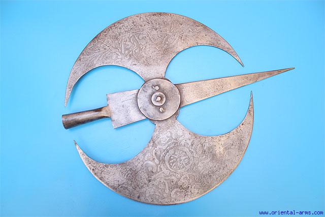 This axe head is from Sudan, early 20 C. in the style of a Persian axe head. Two big 12 inches long, steel blade with a central 13 inches long spear point. One side is etched with Arabic letters. Total length 16 inches. Total width 13 inches. Good hard steel and sharp edges. Very interesting and unusual Axe head. |