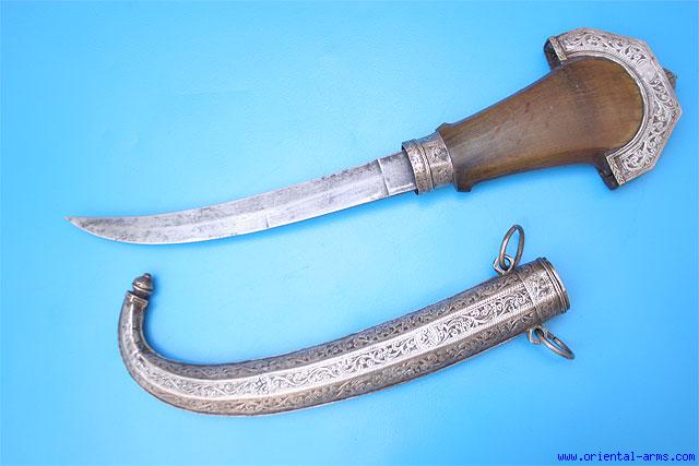 Up for sale is this fine Koumaya Dagger from Morocco dated to 1313 (1895 in the Gregorian calendar). Classical blade, 9 inches long, double edged at its lower half and single edged at the top. The handle is carved from a single massive piece of Rhino horn with a very clear fibrous structure. The pommel head is chased silver as well as the grip collar and scabbard, marked with the local silver proof mark and dated to 1313. Total length16 inches. Very good condition. The silver pommel has few small cracks. |