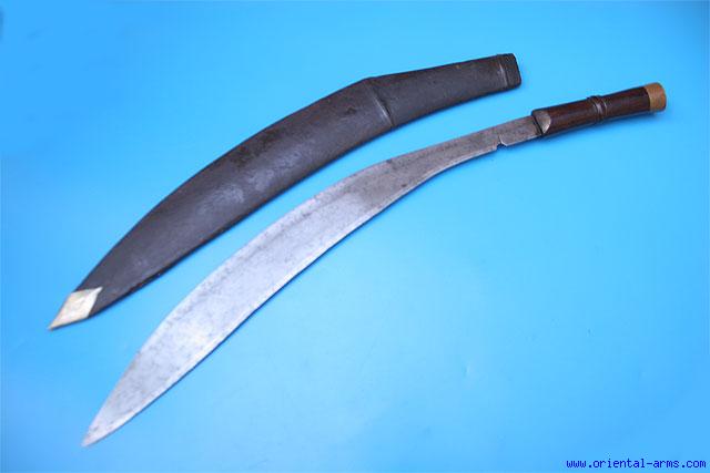 This sacrificial sword is coming from North India, made in the Khukuri style. The long down curving blade is 20 inches long, with a long fuller below the spine. A notch like the Cho notch on the khukuri is cut at the base of the blade just after the short ricasso. Wood handle with brass pommel cover. Wood scabbard covered with the original leather and with white metal scabbard tip. Total length 25 inches. Very good condition. Minor losses the leather cover and the scabbard seams. |