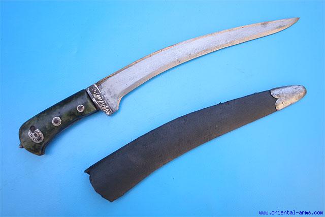 This heavy dagger is Indian, late 18 C. or a bit later. It has a heavy down curving blade with a pronounced T spine, forged from good Indian wootz steel (crystalline). The grips are carved from a dark green stone, riveted to the tang with silver rosettes on the rivets. Silver decorated grip strap and bolsters. Original leather covered scabbard with steel tip. Blade length 11 inches. Total 16 inches. Very good condition. |