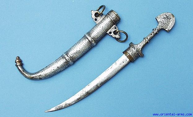 The Moroccan version of the Arab Jambiya dagger is locally called Koumaya and characterized by a slender blade, usually dual edged at its lower half and single edge at the top. There is a big variety in the decoration styles and quality of the handles and scabbards. This one is of a better quality than average, with a relatively good 9 plus inches blade and with a very intricate engraved silver sheet on a brass background. The Dagger was carried with