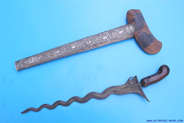 This Keris dagger late 19 or early 20 C. has a wavy blade 13 inches long. The scabbard and handle are Java style , finely carved from grained wood and mounted with chased silver cover. Total length 19 inches. Very good condition.