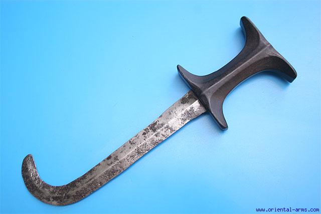 The Beja daggers with the big X shaped handle, sometimes known as Hadendoa or Beni Amer comes from the West South shores of the red sea. This example is known as the “Hooked” shaped blade with a 9 1/2 inches blade and X shaped blackwood handle. Total length 13 ˝ inches. Very good condition. Blackened areas and pitted spots on the blade. |