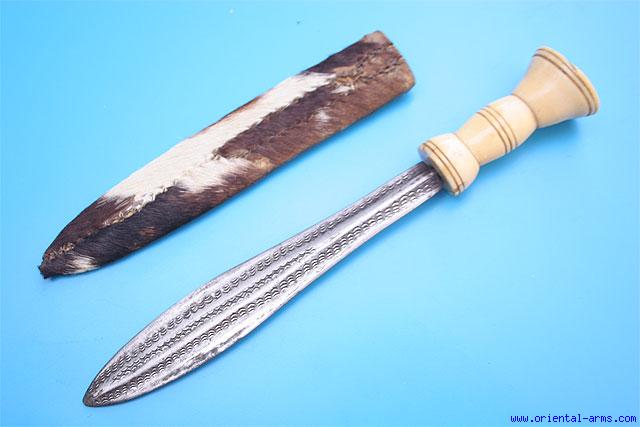 The Fon people of Cameroon uses this dagger mostly as sign of hierarchy and prestige. The relatively massive spear shaped blade is 8 inches long, finely forged with a central rib and very nicely decorated with punched decorations. The handle is ivory with good age color. Fur covered hide scabbard. Total length 11 ½ inches. Very good condition. An interesting fine and rare dagger. |