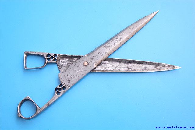 Not exactly a weapon but a very fine exemple of Persian steel craft. This scissors are Persian, 19 C. also known as Qalamdan. and are used to cut paper rolls to the needed size. Hollow ground blades, 3 1/2 inches long. Total length 7 inches. Very good condition. Light distortion of the blades. For similar items see James Allan & Brian Gilmor Persian Steel – The Tanavoli Collection Page 353. |