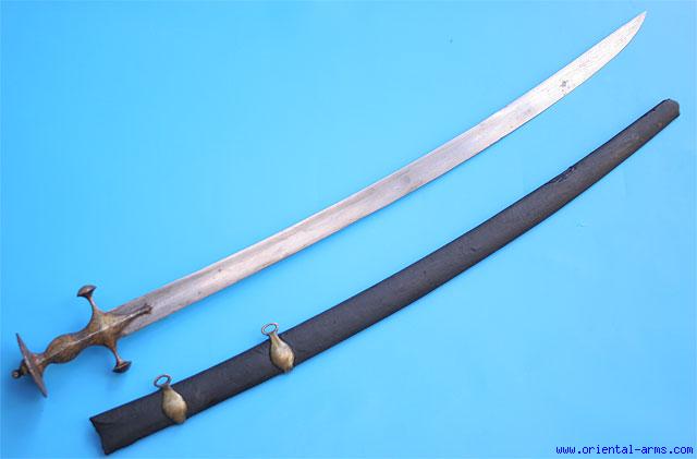 From India, probably 18C or earlier, comes this heavy fighting Tulwar sword. The curved blade is 31 inches long. The steel handle is of classical form and of rather large dimensions with very wide pommel disk. It was very nicely and densely inlaid with gold decoration (true inlay). Original scabbard covered with leather and mounted with brass belt rings. Total length 36 inches. Very good condition. The handle is slightly corroded and there are some losses to the gold inlay. Small losses to the leather on the scabbard. |