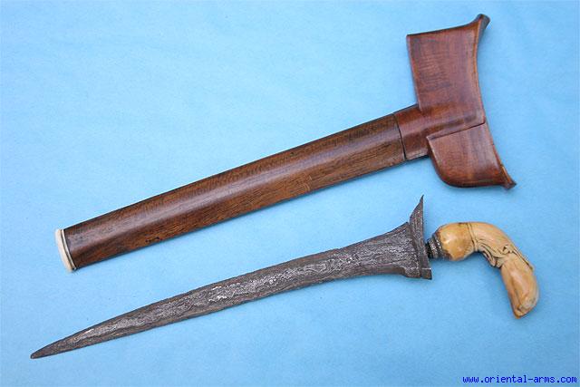 This very good Bugis Keris Dagger has an old slightly curved blade 12 ½ inches long, with clear pamor structure. Ivory grip with silver mendak The scabbard is carved from a beautifully grained wood with an ivory tip. Total Length 17 inches. Very good condition. Very good age patina on the ivory grip. Blade lightly worn. |