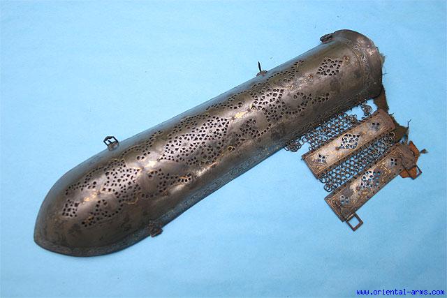 This Indian Bazu-Band (Arm Guard) is from the early 19C. or earlier, rather large dimensions, 16 inches long and 3 1/2 inches wide, whole steel, finely pierced and decorated with gold koftgari work. This arm guard comes with the two small steel plates and buckles used to buckle it over the arm and the original inner fabric cushion (usually these pieces are lost). Very good condition to age. Inner fabric lightly worn. |