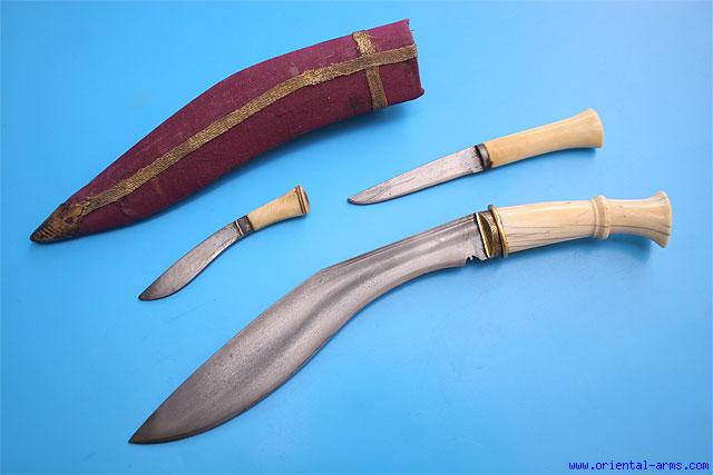 This very fine Khukuri knife is Indian, probably North India, mid 19C. or about. It has a finely forged Wootz (watered, Damascus) steel blade very nicely fullered. The handle is ivory and the bolster is gold decorated steel. This Khukuri is accompanied with a small knife (Karda), also forged from Wootz steel and ivory handle and a Chakma with bone handle. Wood scabbard with fabric cover and gilded steel tip. Blade 8 inches, total 12 ½. Very good condition. The plain steel and bone handle on the Chakma suggests it is a later addition. Khukuries with Wootz steel blade are quite rare. |