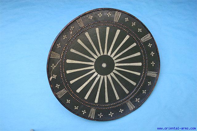 This shields come from the highland Katu tribes of the Montagnard people residing in highland bordering Laos. 19 inches diameter, black lacquered and decorated in painted silver color. Good condition. A crack in the wood (shown in red arrow). Very rare shield. |
