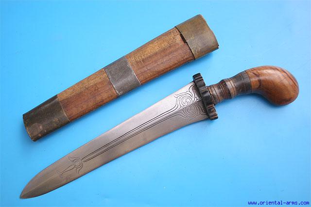 A Punal dagger from the Philippines. These daggers are also known in the name of ‘Belt Kris’ and come in various sizes, from few inches to 15” long. This one is late 19 - early 20 C., 10 ˝” blade 2 inches wide, well forged and decorated with engraved design. The hilt is made from a typical light brown naturally grained wood with horn collar and cross guard. The scabbard is wood, bound with brass and iron bands. Total length 15”. Very good condition. |