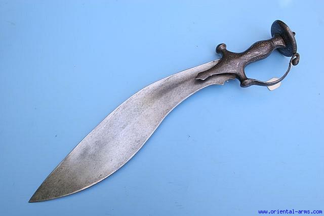 This is an Indian short sword, from the northern areas of India. The blade is short 15 inches long and 3 inches wide, down curving and very heavy. The hilt is a classical Tulwar hilt decorated with silver koftgari work. The interesting part is the notch cut in the heel of the edge, very similar to the notch of the Nepalese Khukuri. My assumption is that the notch is an influence from the neighboring Nepal, and the sword maker wanted to add to the sword some of the superb qualities of the Khukuri by imitating the notch.