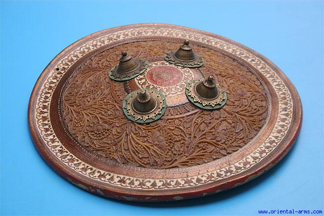 This very rare shield is made from the hide of a rhinoceros, India, 19C. most probably from Rajhastan. It is very strong and supposedly can stop a small caliber bullet. 13 ½ inches diameter, very finely chiseled with dense floral design and painted with red white green and gold colors on the perimeter and the central medallion. Four high and engraved brass bosses. Original hand cushion and handles on the back side. It is shown below photographed against light source to show its transparency (Typical to rhino hide). Very good plus condition. Very light age distortion. One handle torn. |