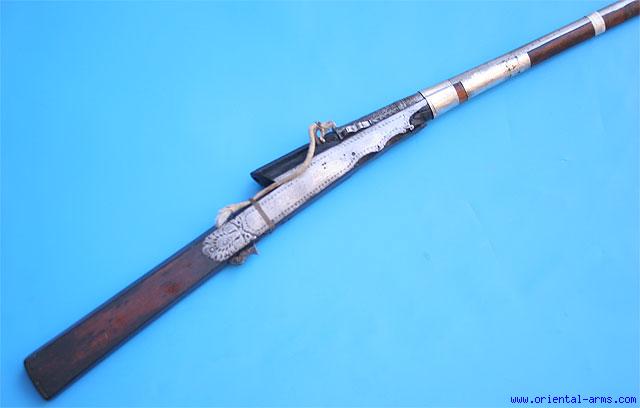 This is aToradar an Indian Matchlock gun, probably late 18 to early 19 C. 42 inches barrel finely chiseled on the breach and on the muzzle. Hard wood stock The barrel is bound to the stock with silver bands (restored). Total length 62 inches. Very good condition. Minor wood chips and old repairs on the stock |
