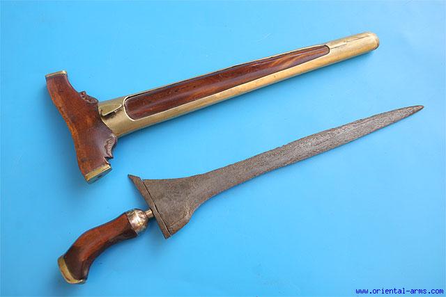 Up for sale is this small but very good and somewhat unusual Keris dagger. Pamor blade 9 inches long. Wood grip and scabbard with brass mounts. Total length 13 inches. Very good condition.