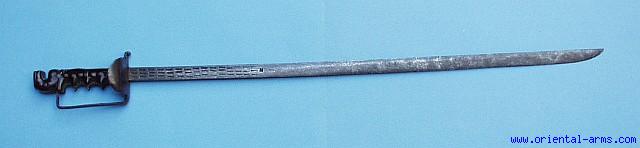 This curious sword is probably of North African origin. The strong Spanish influence suggest a Spanish Morocco origin. The blade is 33 inches long, single edge and marked with a series of markings on the heel. The handle is horn layers with brass separators riveted to the tang with brass rivets and decorated with many brass nails on both top and bottom sides. Steel cross guard and D guard. No scabbard. Good condition with minor pitted area near the tip. A very interesting and uncommon sword. |
