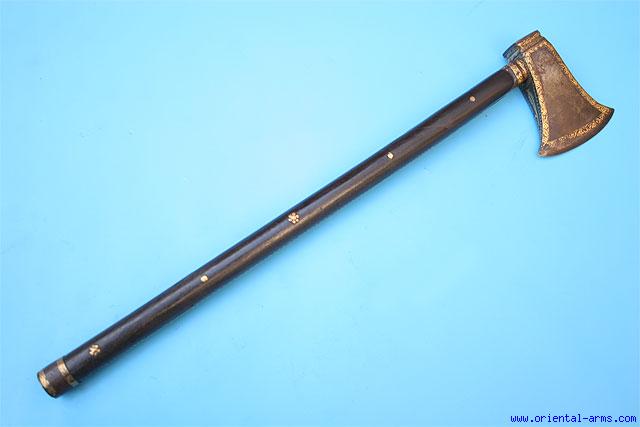 This fine, small axe is also known as Tabarzine, or saddle axe. The heavy blade is 2 1/2 inches wide, 3 1/2 inches tall, forged from very good steel. The handle is made of a central steel haft with ebony grips, 16 inches long riveted to the tang with silded rivets. The blade is very richly decorated with gold koftgari work and so are the side edges of the haft and the steel tip. Very good condition. Good age patina on the blade and on the ebony grips. Minor losses to the koftgari decoration on the blade. |