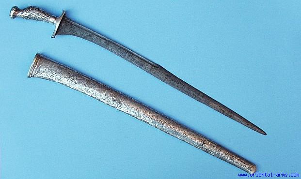 The ‘Pedang’ is an Indonesian short sword, common in Java but can be found also in other Indonesian islands. This one is one of quality highly decorated and probably belonged to a high ranking person. The blade is more than 20 inches long, straight back, with slightly down curving tip and with 11 inches back edge. It is forged from very good pamor steel clearly evident all over the blade. The hilt is worked in heavy silver in a styled human shape, highly decorated and engraved. The scabbard is wood covered with thin silver sheet engraved in a very intricate design. Very good condition with only small area on both sides ½ lnches holes and minor denting of the silver sheath. Dated probably to the second half of the 19 C. |