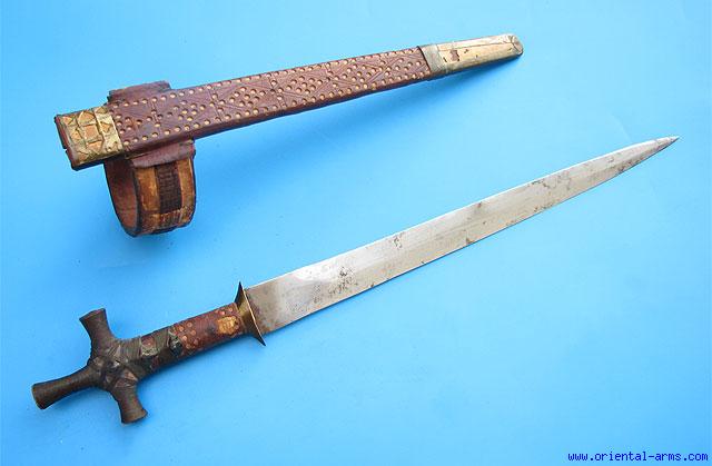 One of the many Variants of the Arm Dagger carried by the Tuareg also known as Telek . It is characterized by the cross shaped pommel (A relic from their Christian origin ??) . This specific one has a 13 ½ inches heavy blade of diamond cross section and 1 ½ inches ricasso. Wood handle with cross shaped pommel with brass mounts and brass wire binding. Leather collar and leather scabbard and arm ring. Total length (in scabbard) 20 inches. Very good condition. Rare authentic early 20 C. item |