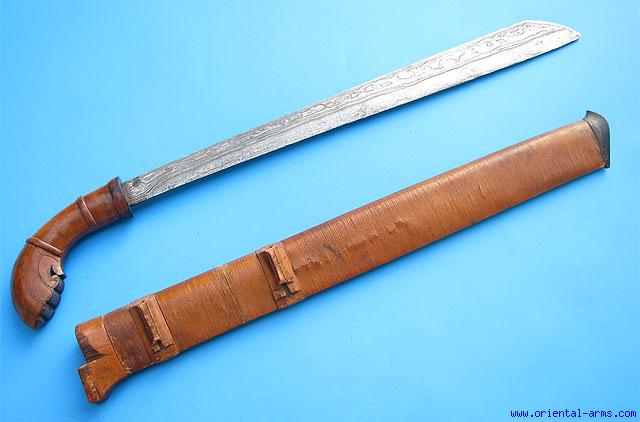 This short sword from the Klewang family is late 19 C. probably from Java. Very fine pamor blade 17 ½ inches long. Finely carved hardwood hndle and wood scabbard bound with fine fibers. Total length 23 inches. Very good condition. Minor wood chips on the scabbard. |