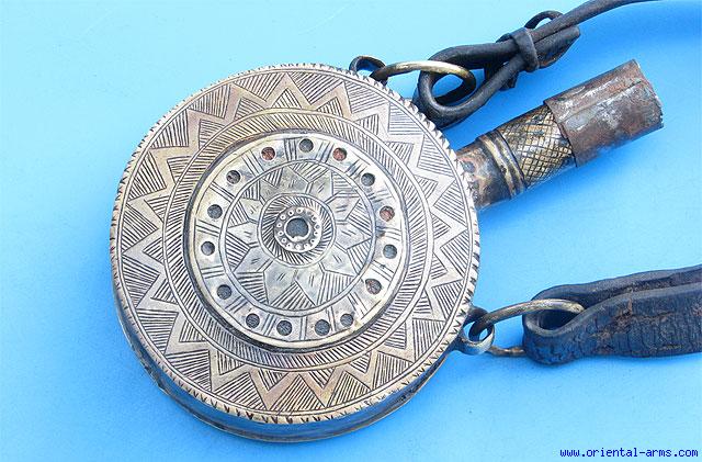 From Morocco comes this bottle shaped powder flask, made brass beautifully engraved on its front face, 3 1/2 inches diameter, 1 1/2 inches thick and 5 inches tall. It comes with its original leather hanging belt. Very good condition.