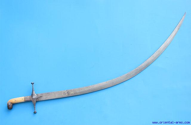 A Shamshir, the Eastern saber that for centuries enchanted the world and was copied in practically all armies of the western world. A light, deeply curved, wedge shape blade of minimal and simple design and yet a lethal slashing weapon in the experienced hand. Here we offer for sale a classical Shamshir sword, with a fine Persian 18 C. wootz blade, marked with a maker stamp and the Persian lion stamp. Bone grips bound with twisted silver wire to reinforce the cross guard in position (later addition?) Down curving steel pommel and steel cross-guard. Blade 31 inches, 6total 36. Very good condition. No scabbard. |