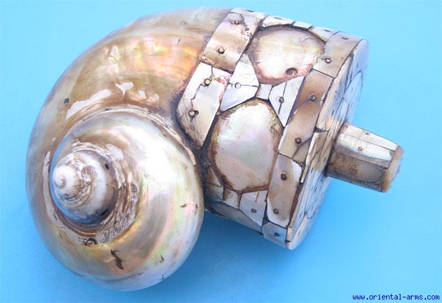 This powder flask is Indian Moghul period, early 19C. or about. It is made of sea shell with a mosaic of sea shell cover. 5 inches long. Rare item.