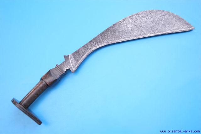 The Ayda Katti is the national sword of the Coorg of Malabar, the South West coastal area of India. It is one of the rarest swords in the Indian arsenal and of a very peculiar shape. It reminds in a way an agricultural tool, but it is a real weapon and a deadly one in the experienced hands. The blade of this one is of a sickle shape 16 inches long and 4 inches wide at its widest point with a massive steel bolster. The handle is carved horn checkered around the grips area, with a kite shaped horn pommel. 22 inches total length. Very good condition. Good age patina on the blade. |
