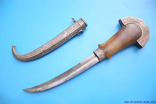Up for sale is this fine Koumaya Dagger from Morocco dated to 1310 (1892 in the Gregorian calendar). Well forged fullered blade, 9 inches long, double edged at its lower half and single edged at the top. The handle is carved from a single massive piece of Rhino horn with a very clear fibrous structure. The pommel head is chased silver as well as the grip collar and scabbard, both marked with the local silver proof mark and dated to 1310. Total length16 inches. Very good condition. The silver pommel has few small cracks and minor solder repairs. |