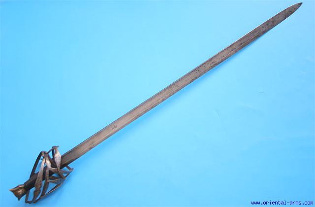 This broadsword is Italin, 17C. or earlier also known as Schiavona . The signed blade is 34 ½ inches long, very well made. Basket hilt with leather covered grip and brass pommel. Total length 39 inches. Very good condition. A catalog number (087) on a small brass disk is attached to the hilt basket.