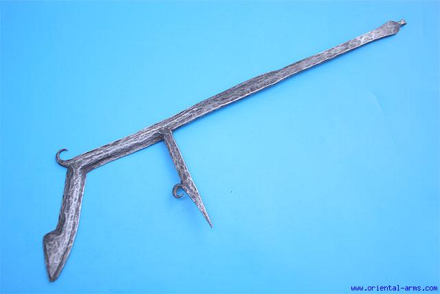 This throwing knife is common to the Sara people of southern Chad, specifically to the Laka and /or Ngambaye tribes. It is of a more styled shape than the simpler F shaped throwing knives. Well forged and decorated with hammered spots. Length 22 inches. Very good condition. |