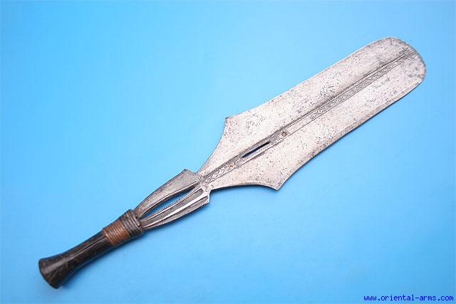 From the central Zaire, comes this fine sword of the Ngombe people. Very finely forged steel blade 18 inches long, 5 inches wide with step along its center nicely engraved and set with copper inserts. Wood handle with copper strip binding. Total length 22 ½ inches. Very good condition. No scabbard. An old catalog number is printed on the handle. The fine quality suggests that this sword is coming from an important collection and probably belonged to a high ranking person in the tribe. |