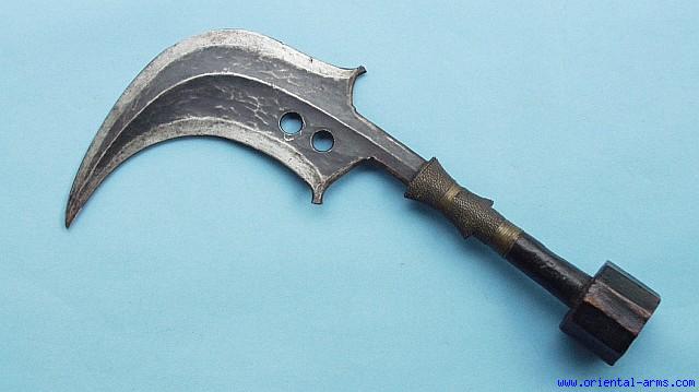 The knife of the Mangbetu people residing in Central Africa was originally used as a weapon of war and also as an agricultural implement, but later on developed into luxury item and a symbol of status. One of the photos show a drawing from the late 19 C. of Munza the king of the Mangbetu on his crown, holding high a similar knife as a symbol of power and authority. This one is an early 20 C. piece, sickle shaped. 10 inches (point to point) blade, 17 inches total length (tip of blade to pommel). The handle is dark wood bound with twisted brass wires and brass strips. Very good condition, Original blackened color of the blade and very good age patina on the handle.