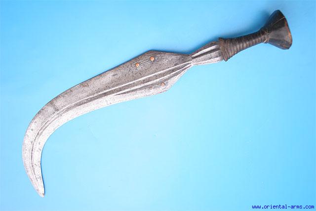 This fine sword is coming from Zaire, Africa, most probably the Ngombe people. Very finely forged steel blade, sickle shaped and very nicely fullered, finely engraved and inserted with copper inserts.