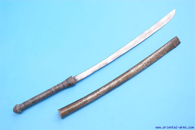 This Dah sword is most probably from Thailand, northern areas, late 19 C. Blade 21 inches with hardened edge and ridges spine. Chased silver handle. Silver covered scabbard. Total length 33 inches. Very good condition. Good age patina on the silver. Losses to the silver handle. Minor dents and cracks on the scabbard. |