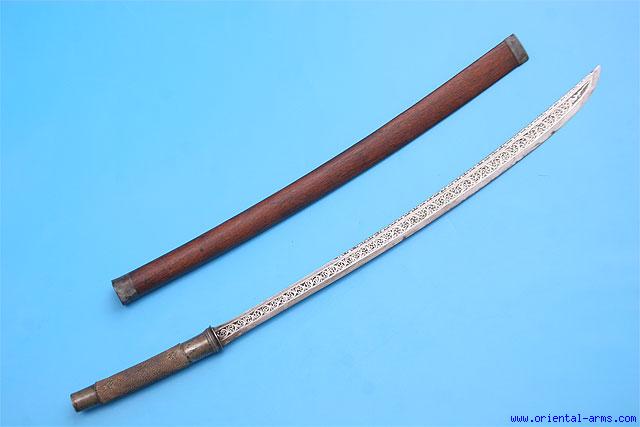 This fine Dah sword is Burmese, early 20C. 25 ½ inches blade very finely inlaid with silver koftgari work on its entire length including the partially ridged spine. The grip is covered with Sting Ray skin with silver mounts. The scabbard is dark wood with brass binding bands. Total length 33 ½ inches. Very good condition. Minor damage to the upper brass band on the scabbard. |