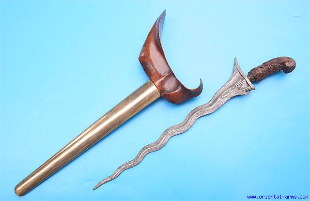 This Keris dagger is most probably Java, early – mid 20C., with a Madura style handle. Wavy blade of good pamor steel, 14 inches long. Finely carved wood handle. Fine scabbard with gilded(?) metal cover. Total length 19 inches. Very good condition. Very low price. |
