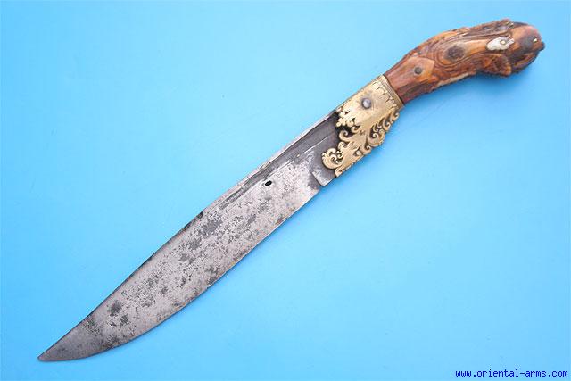 Up for sale is this early, 18C. or earlier, good “PIHA KAHETTA” the traditional knife of the Sinhalese from Sri-Lanka (Ceylon). It has a single edged short heavy blade, 9 inches long with a clipped tip and heavy brass bolster. The grips are beautifully carved from ivory with dark, shining age patina. Total length is 12 ˝ inches. Very good condition. Blackened spots and minor patches of pitted areas. Pommel cover is missing. |