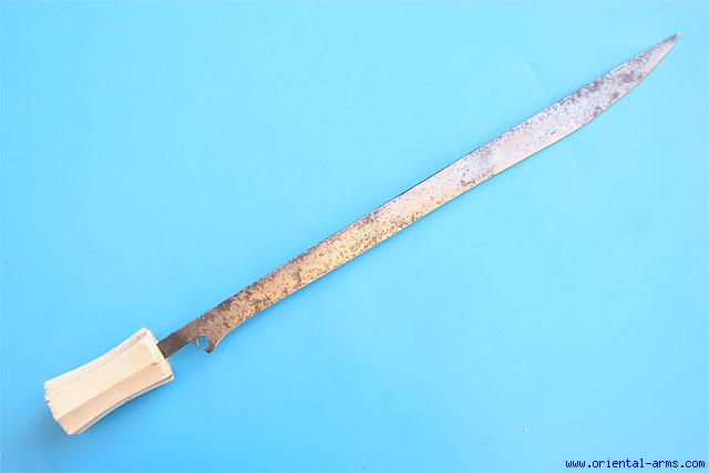 One of the rarest form of swords from Sumatra is this sword of the Toba Batak people, also known as Piso Gading. The single edge blade is 17 inches long. The fluted handle is cut from a massive piece of elephant ivory. Total length 20 inches. Very good condition. Few patches of very light pitting on the blade. No scabbard. For a similar swords see also: Albert G. Van Zonneveld Traditional Weapons of the Indonesian Archipelago Fig 421 P. 107, and Achim Sibeth The Batak- Peoples of the Island of Sumatra Fig 212 P. 163. A rare sword. |