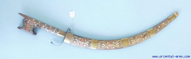 A very decorative presentation “NIMCHA” knife / dagger from Morocco. It has an 16 inches blade (almost twice than the usual similar 8-9 inches blades), single edge blade of deep curvature. The blade is engraved in a typical design. The hilt and the scabbard are made of hardwood and are inlaid with white metal wires and red colored panels in a very intricate and typical Moroccan design. The condition is good. Blade is clean with few light pitting signs. Hilt and scabbard decoration are intact. It is not a fighting weapon but a very decorative example and of good workmanship. It is a nice addition to a collection of Oriental Weapon / art, at a very attractive price. |