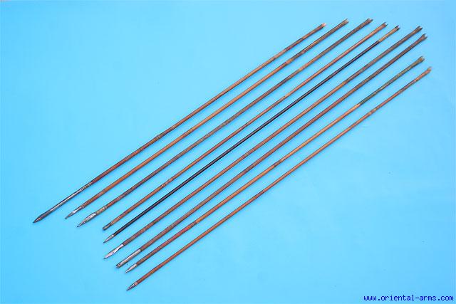 This lot of arrows is of Indian origin, late 18 or early 19 C. It includes 9 arrows: Hunting arrows with small steel tips, battle arrows with bigger armor piercing heads a bird hunting arrow with blunt head and one with very unusual tip. The shafts are made of bamboo. Blades ½ - 4 inches, Total length 27-31 inches. |
