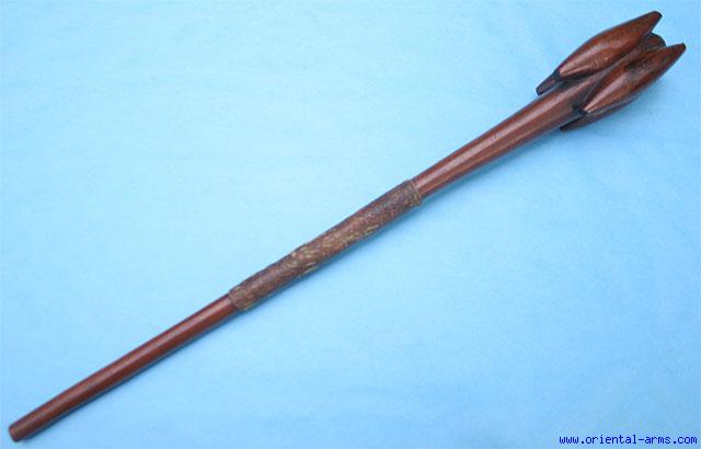 Up for sale is this rare Zulu Knobkerrie club. 4 inches long head of unusual form with four large side lobes. 6 inches of raw hide cover in the center of the haft. Total length 24 inches. Very good condition. Shining age patina.