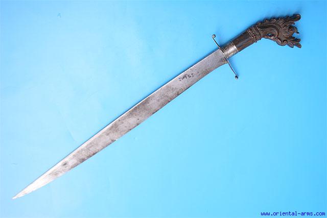 This fine short sword is coming probably from North Philippines. The blade with acute tip is 21 inches long with 11 inches false edge. Horn handle with a beautifully carved horse (?) head pommel, with silver collar and silver cross guard. Total length 27 inches. Very good condition. Minor edge nicks. No scabbard. |