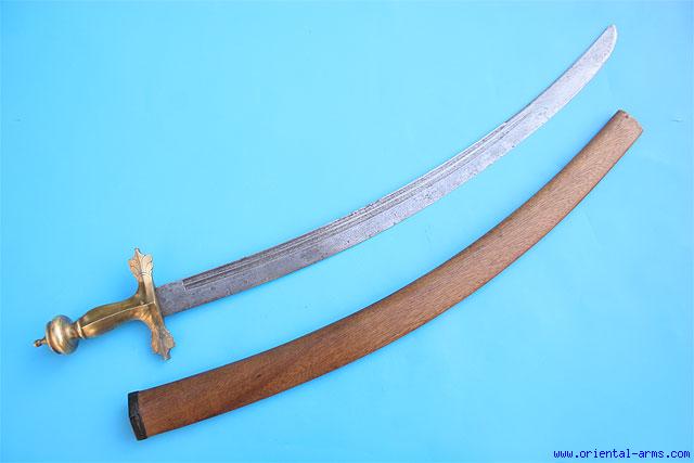 The Podang, sometimes also known as Piso Podang is a sword common to Sumatra and specifically to the Batak People. The influence of the Indian Tulwar sword on its specific hilt shape is evident. This very good example has a single edged fullered and curved blade, 23 inches long with a 7 inches back edge. The Solid brass hilt is of a typical form with a reverse cup shape pommel. Wood scabbard with bone locket. Total length 29 inches. Very good condition. |