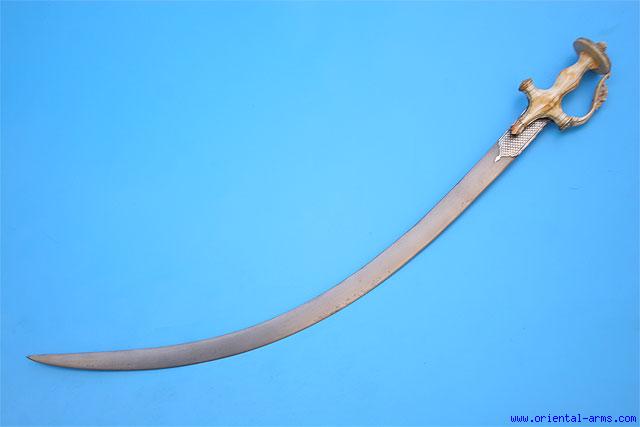 This fine Shamshir is Indian, 18 C. or about, employing a Persian (??) made wootz blade, single edge 28 inches long with traces of maker stamp. Elephant ivory, Tulwar style handle. Total length 32 inches. Very good condition. Good age patina on the handle. Old repaired crack on the pommel. Fine piece. Rare ivory handle. |