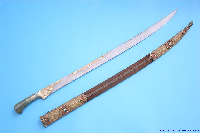 This very fine saber is coming from central Asia, Bukhara style, but with strong Ottoman influence, late 19 C. Fine single edge blde very slightly curved, 28 Inches long and forged from very fine pattern welded steel. The blade is decorated with gold inlay decoration and inscriptions in Arabic letters. Jade (or Jadeite) grips and gilded silver bolsters set with turquoise stones. Wood scabbard with finely chased brass locket and chape set with colored stones, turquoises and ribbed corals. Total length 36 inches. Very good condition. One of the bolsters has a later repair with the turquoise stone missing. The strong Ottoman decoration style of the scabbard suggest it might be later to the blade, made by a Turkish maker.
