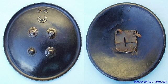 This is a very good Indo-Persian Hyde shield. The shield diameter is 20 ½ inches, 3 inches high. It is made of heavy Hyde (Buffalo ??) covered with black lacquer, with four pierced brass in the center and a lunette shape boss with two small ones at the top. Inner lether cushion plate with leather straps for the handle. Good condition. There are some cracks and small area of damage to the lacquer on the inner side. The hand cushion is cut and the lether straps are torn. One of the brass bosses is different from the other. May be a replaced one but very old replacement. |