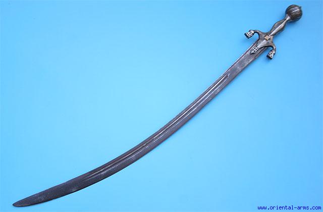 The Pulwar is the Afghan relative of the Indian Tulwar. The Pulwar hilt has a very distinct shape, with down curving quillons. The one offered here for sale is a very good heavy fighting sword, with well forged and nicely fullered steel blade, 31 inches long, with an 8 inches back edge. The steel handle is of classical shape with a rare ball shaped pommel. Total length 36 inches. Very good condition. Good age patina on the steel. Very good fighting sword. Very well balanced. |